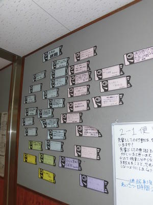 2年生の教室前には、「5月の挑戦」と題した子どもたちの”決意”が書かれています。
