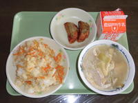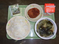給食メニュー→ごはん お茶ふりかけ 牛乳 ごぼうメンチカツ・ソースかけ わかめともやしのみそ汁