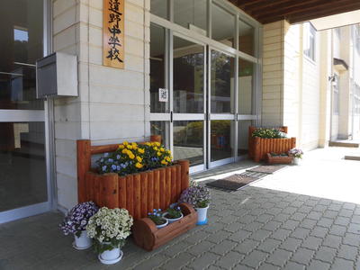 用務員さんが手入れをしている花々が、子どもたちや来校者を出迎えています。