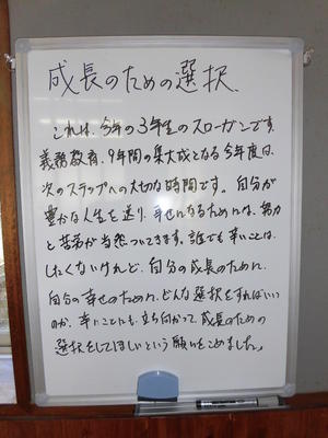義務教育最終年度を迎え、自分で進路を決定していく時期がやってきます。スローガンには、将来を見据え、自分の成長につながる選択をしてほしいという担任の願いが込められています。