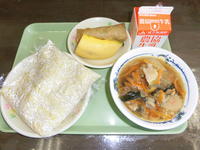 メニュー→醬油ラーメン(中華ソフトめん+醤油味スープ)、牛乳、野菜春巻き、バナナ