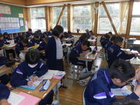 「アイスプラネット」(椎名誠)という資料を使った、「人物の言動に着目し、心情の変化をとらえる」ことを目標とする学習。今日の授業では、「登場人物たちは、ぐうちゃん(38歳の居候)をどのように思っているのか」の課題で、子どもたちはそれぞれの立場になって、真剣に考えていました。