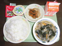 メニュー→ごはん 野菜ふりかけ 牛乳 とり肉のガーリックソースかけ ワンタンスープ 牛乳プリン