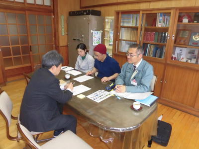 遠野支所の地域振興担当員の鈴木 司様、地域おこし協力隊の平山 祐様、平山綾子様にお出でいただき、具体的な日程や体験内容の打合せを行いました。