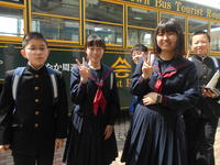 解散式をバスの中で行い、バスに手を振る、学校下で降りた生徒たち。