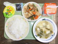 メニュー→ごはん、きくらげのり、牛乳、たけのこのおかか煮、春野菜のみそ汁、はちみつレモンゼリー
