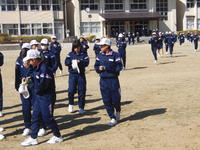 校庭で集団行動の学習に取り組む2年生の授業風景です。