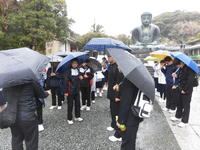 鎌倉の大仏に到着。あいにくの雨でした。班別自主研修は、ここからスタートです。