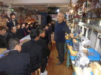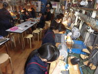 浅草、江戸切子「おじま」での体験学習。説明の後、各自、悪戦苦闘しながらグラスに模様をつけました。