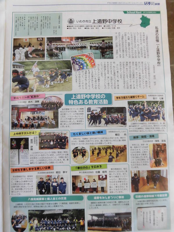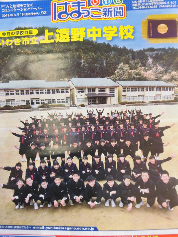 はまっこ新聞が贈られてきました。1面は全校生、教職員の集合写真。そして2面、上遠野中学校紹介では、3年生が執筆を担当しました。生徒が生き生きと活躍する本校らしい記事になったと思います。