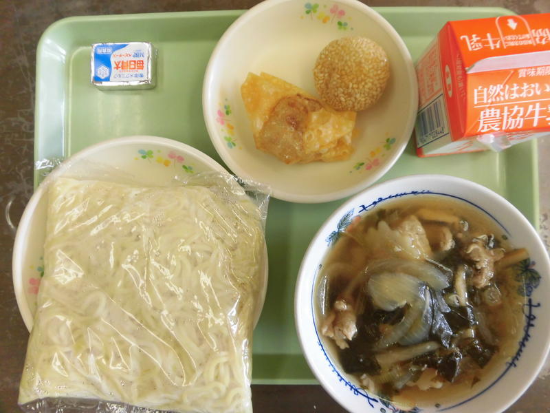 白河ラーメン(中華ソフトめん) 揚げワンタン 中華ごま団子 牛乳 チーズ