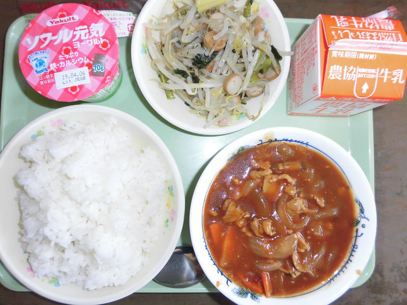 ハヤシライス もやしとウインナーの黒こしょう炒め 牛乳 ヨーグルト