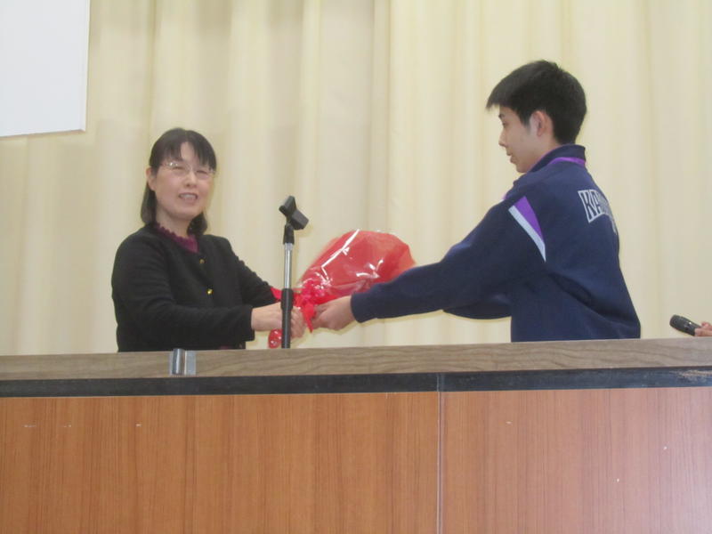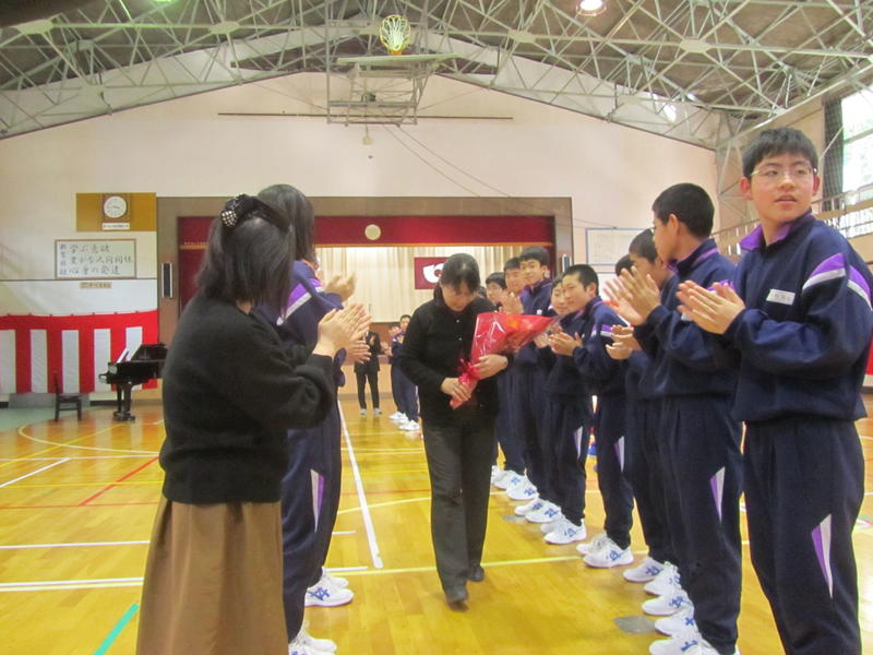 村上 由紀子 先生が、今年度で上遠野中学校のご勤務を終えられる予定です。今日がご勤務最終日なので、放課後、体育館でお別れ会を行いました。