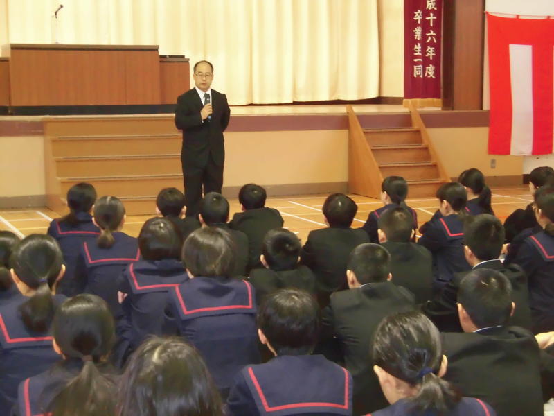 終業式の後、生徒指導主事の比佐 哲 先生から、3学期の生活の振り返りと春休みの過ごし方についてのお話がありました。