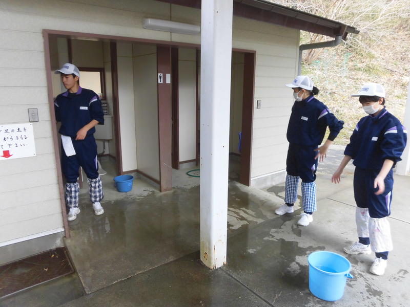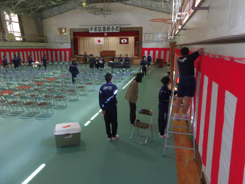 いよいよ明日は卒業式。2年生は会場づくりです。パイプイスを丁寧に並べたり、紅白幕をしっかりと張ったり、式にふさわしい会場を作ろうと一生懸命です。1年生は、3年教室や、玄関、廊下を中心に校舎の清掃です。きれいな校舎で3年生を迎えようとこちらも頑張っています。