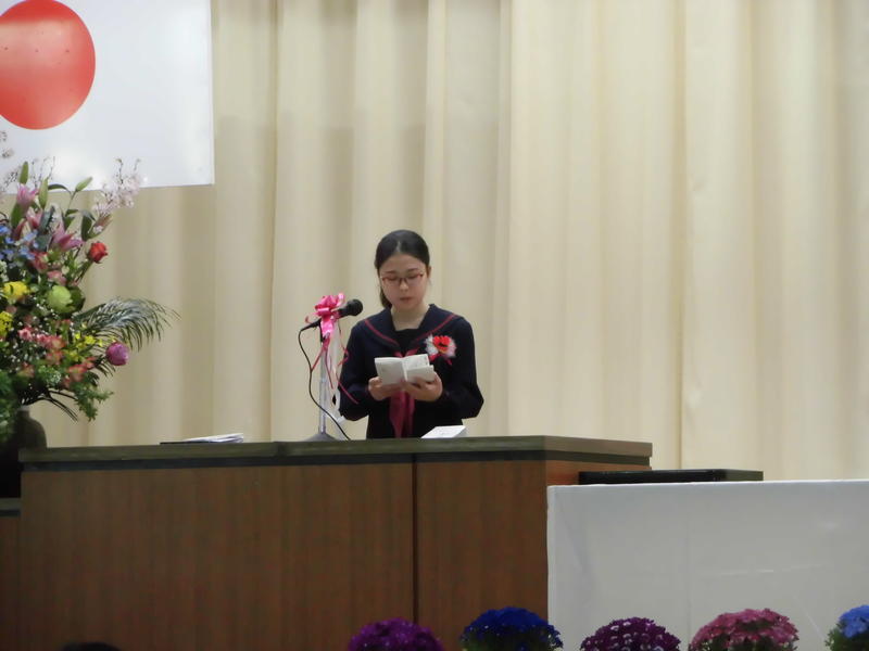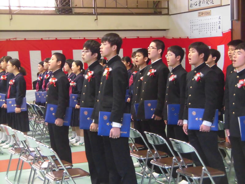 式歌は、とても感動的でした。3年生が、上遠野 宙くんの伴奏で「仰げば尊し」1,2年生が2年、猪狩 知裕くんの伴奏で「蛍の光」、そして、3年生が、上遠野宙くんの伴奏で「旅立ちの日に」を歌いました。「旅立ちの日に」の曲の合間には、鈴木 蓮華さんがマイクの前に進み、メッセージを読み上げました。先生方へ、後輩へ感謝の言葉、そして保護者へ。「生まれたときからずっとそばに寄り添ってくれたお父さん、お母さん。私たちはこんなに大きく成長しました。悩んでいるとき、落ち込んでいるとき、いつでも私たちを理解してくれて、一番の味方になってくれました。普段は言えないけれど、本当にありがとうの気持ちでいっぱいです・・・」そして最後にクラスのみんなへ。「・・・部活動も、紅葉祭も、つい昨日のことのように思い出されます。全部このクラスだったから乗り越えることができたんだと思います。たわいもないことで笑い合った時間がとても楽しかったです・・・最後は全員笑って卒業しましょう。みんな大好きです。」