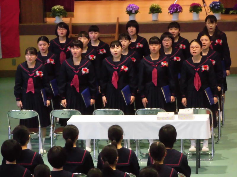 全校生、職員で歌う「校歌斉唱」では、1年、生田目樹里さんが伴奏を務めました。