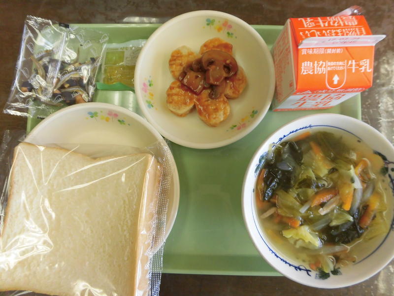 野菜スープ 豆腐ハンバーグ、ソースかけ 食パン リンゴジャム 牛乳 黒豆小魚