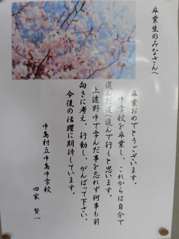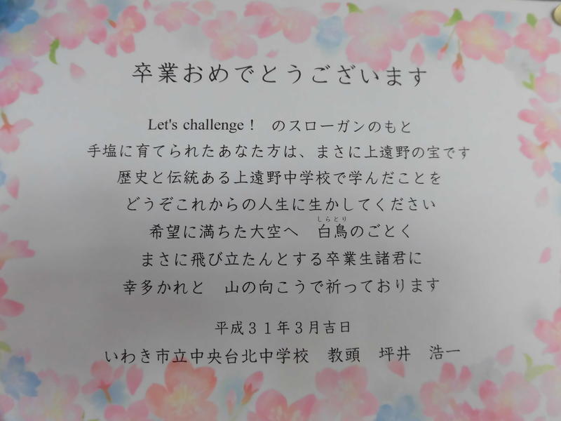 上遠野中学校3年生、全員が見事合格しました よかった。本当によかった 倍率が厳しい学科もあったので心配していました。最後は日頃の生活態度やひたむきな努力が決め手だったのでしょう。ここからがスタート、3年後に、自分の行きたい道に進めました、と、また報告ができるように頑張ってください。