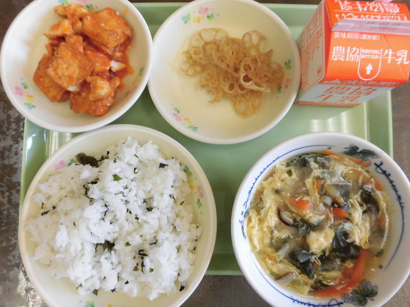 中華玉子スープ 生揚げと鶏のチリソース煮、レンコンチップス わかめごはん 牛乳