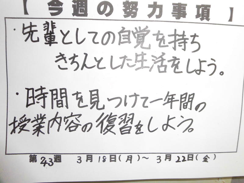 今年度もいよいよあと1週間。週番引き継ぎでは、1,2年生が目標を立てました。