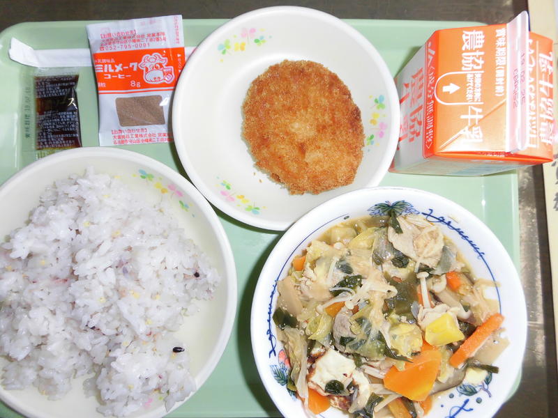 キムチチゲ チキンカツ ソース 雑穀ごはん 牛乳 コーヒー