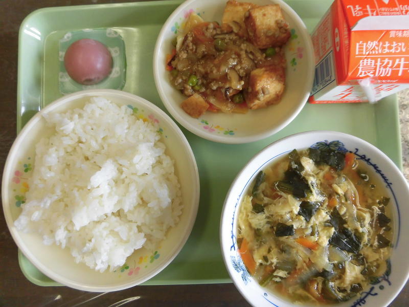 かき玉汁 マーボー厚揚げ 発芽入りごはん 牛乳 一口イチゴゼリー