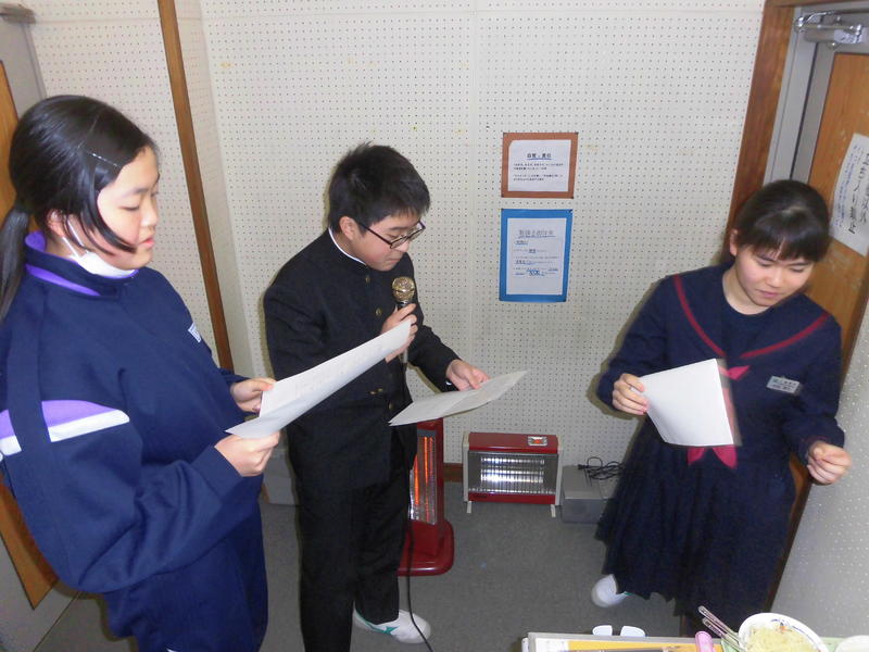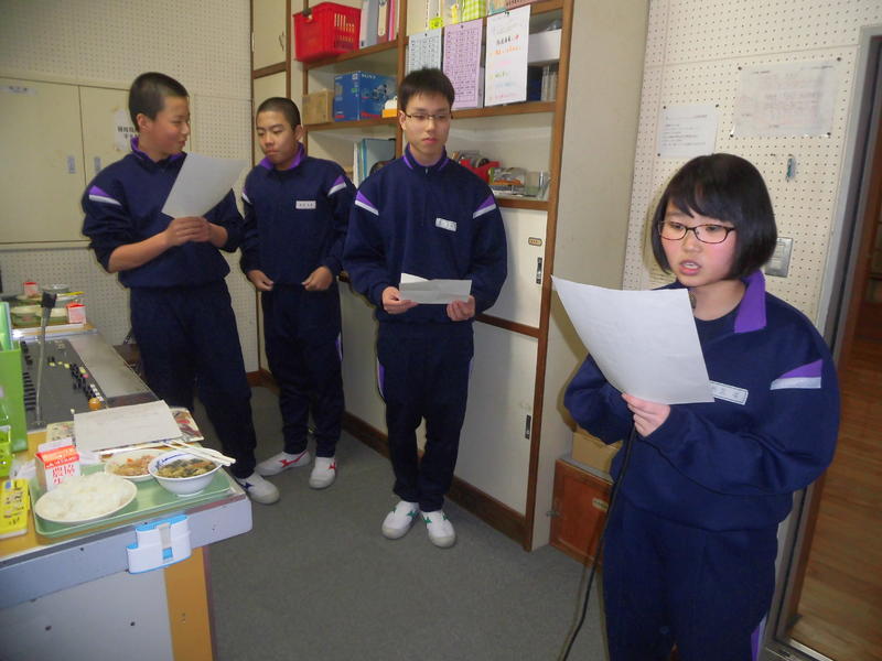 「今日は雑穀ごはんです。雑穀とは、ごはんや小麦などの主食以外のことをいいます。きびだんごの『きび』、あわまんじゅうの『粟』などです。お米だけでは取ることのできないビタミンやミネラルが含まれています。雑穀が苦手な人もいるでしょうから、味付けの濃いおかずに組み合わせています。良く噛んで食べましょう。」