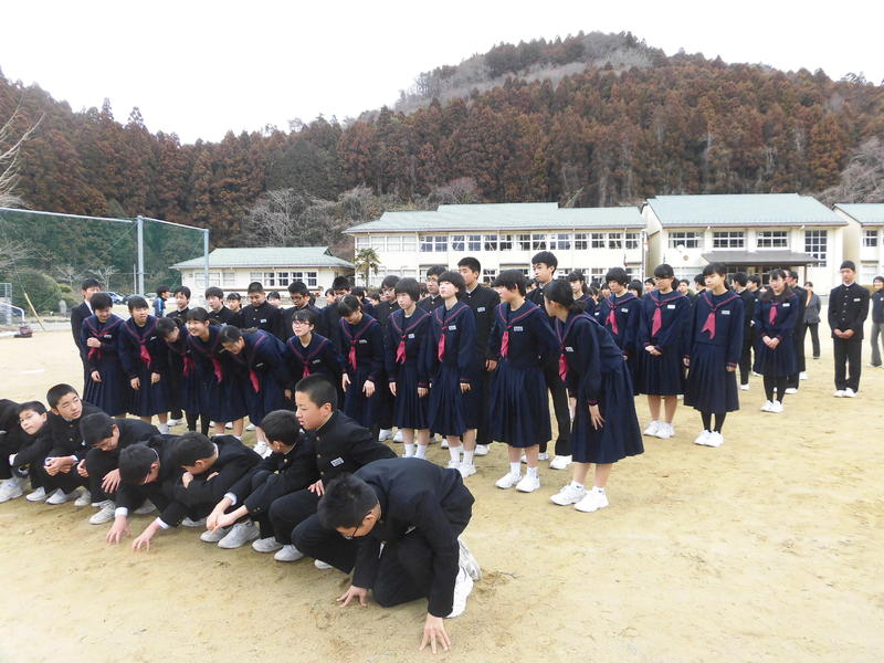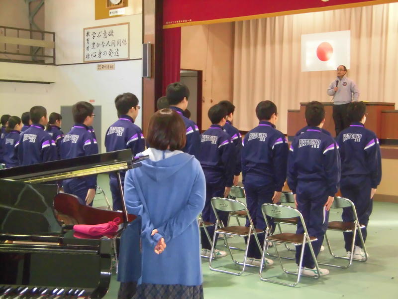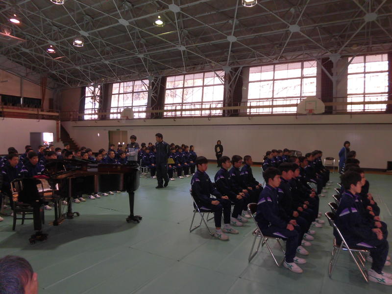 まずは全体練習です。教務主任の北原 亮嗣 先生より、卒業式の意義、式に向けての心構えのお話がありました。「卒業生は今まで育てて頂いた感謝の気持ちを、卒業式の立派な姿で表しましょう。在校生は大きな節目を迎えた先輩を祝い、最高の門出になるように支えましょう。そして先輩の姿を上遠野中の伝統として引き継ぎましょう。」