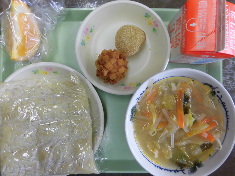 味噌ラーメン (中華ソフトめん) ごま団子 エビ団子 牛乳 いよかん