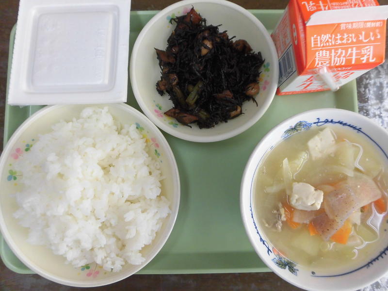 2019年2月20日 12時35分豚汁 ひじきの油炒め 納豆 ごはん 牛乳