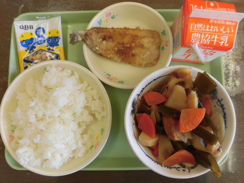 2月3日は節分です。節分にはイワシを食べたり、豆まきをして豆を食べたりして、健康に過ごせるように願う風習があります。また今年の2月5日は「旧正月」です。いわき市では旧正月には「おひら」という煮物料理を食べていたそうです。今日は2つの行事をあわせた献立です。