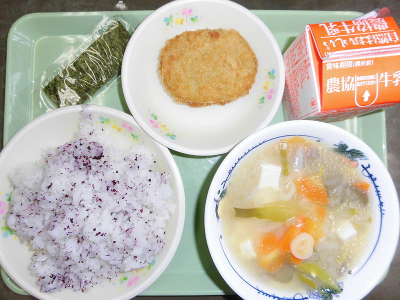 味噌けんちん汁 カボチャコロッケ ゆかりごはん 焼き海苔 牛乳