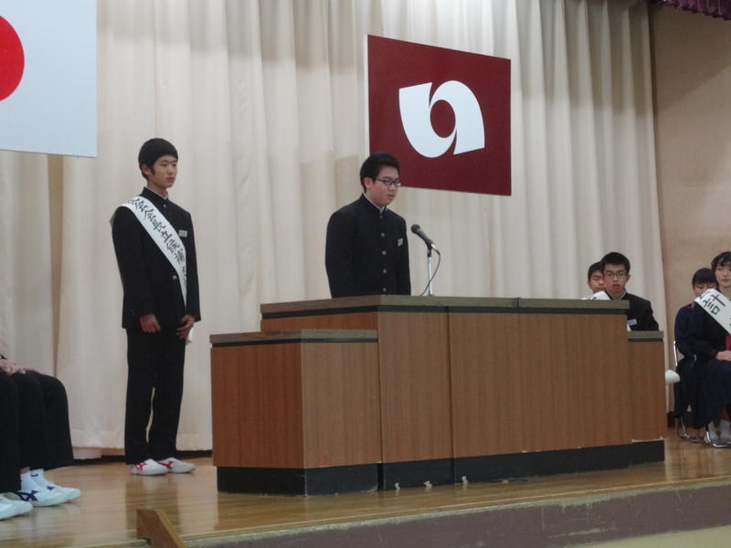 選挙管理委員会が進行を務め、立候補者、応援弁士が演説を行いました。その後、投票です。全校生は来年度の生徒会活動の充実をめざして、真剣に演説に耳を傾けていました。