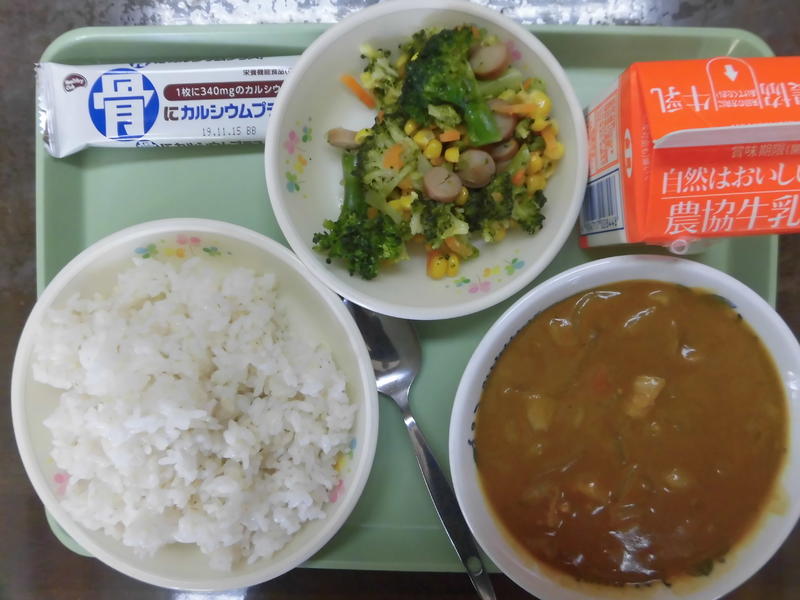 チキンカレー 麦ごはん ブロッコリーソテー 牛乳 カルシウムウエハース