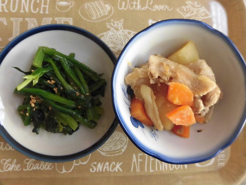 肉じゃがは、甘すぎず塩っぱすぎず、伊ジャガイモも煮崩れせず、肉の大きさもほどよい柔らかさでおいしかったです。ほうれん草のごま和えは、ほうれん草のゆで加減が絶妙で、みずみずしかったです。ご馳走様でした。