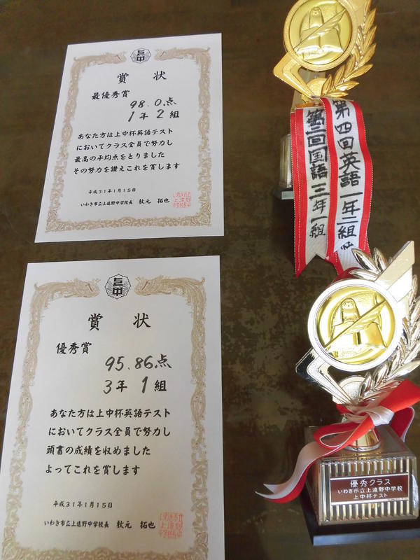 最優秀クラス賞は、クラス平均点98.0点で1年2組が受賞しました。よく頑張りましたね。優秀クラス賞は、クラス平均点95.86点で3年1組が受賞しました。