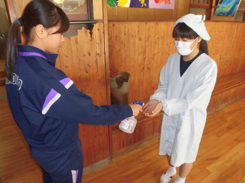 給食の運搬の前に、給食当番は手をアルコール消毒します。みんなの給食を配膳するので念には念を。
