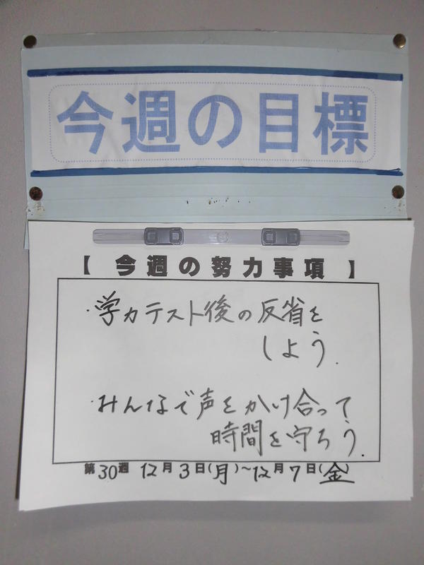 本日12月3日(月)は、全校生、学力テストです。学期の締めくくりの大きなテストですので、テスト反省をしっかりと行い、不十分なところの理解を深めましょう。