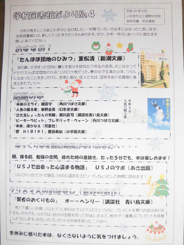 ※坂本先生が、学校図書館だよりを発行しました。カラフルですてきな内容です。