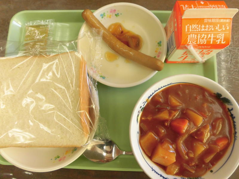 ポークシチュー 食パン2枚 いわき市産梨ジャム ウィンナーきのこソースかけ 牛乳