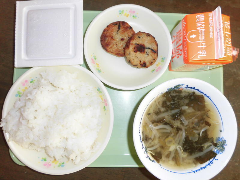 とりつくね2つ もやしとしいたけのみそ汁 県産大豆納豆 ごはん 牛乳