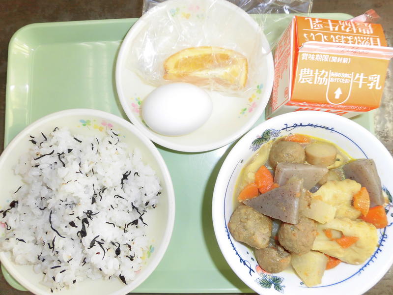 カレーおでん 味付きゆで卵 しそひじきごはん 牛乳 オレンジ