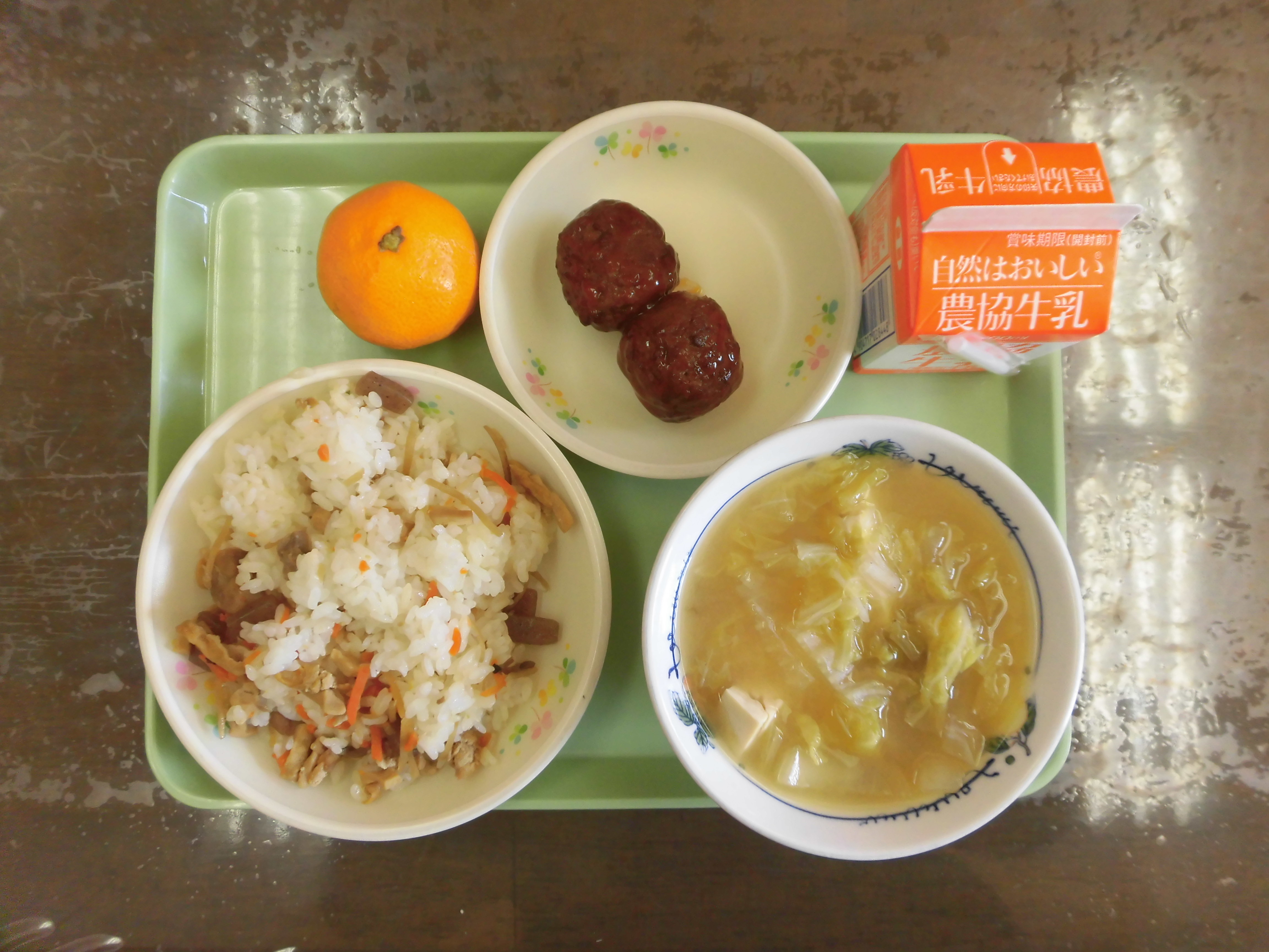 かやくご飯 肉団子 白菜の味噌汁 ミカン 牛乳