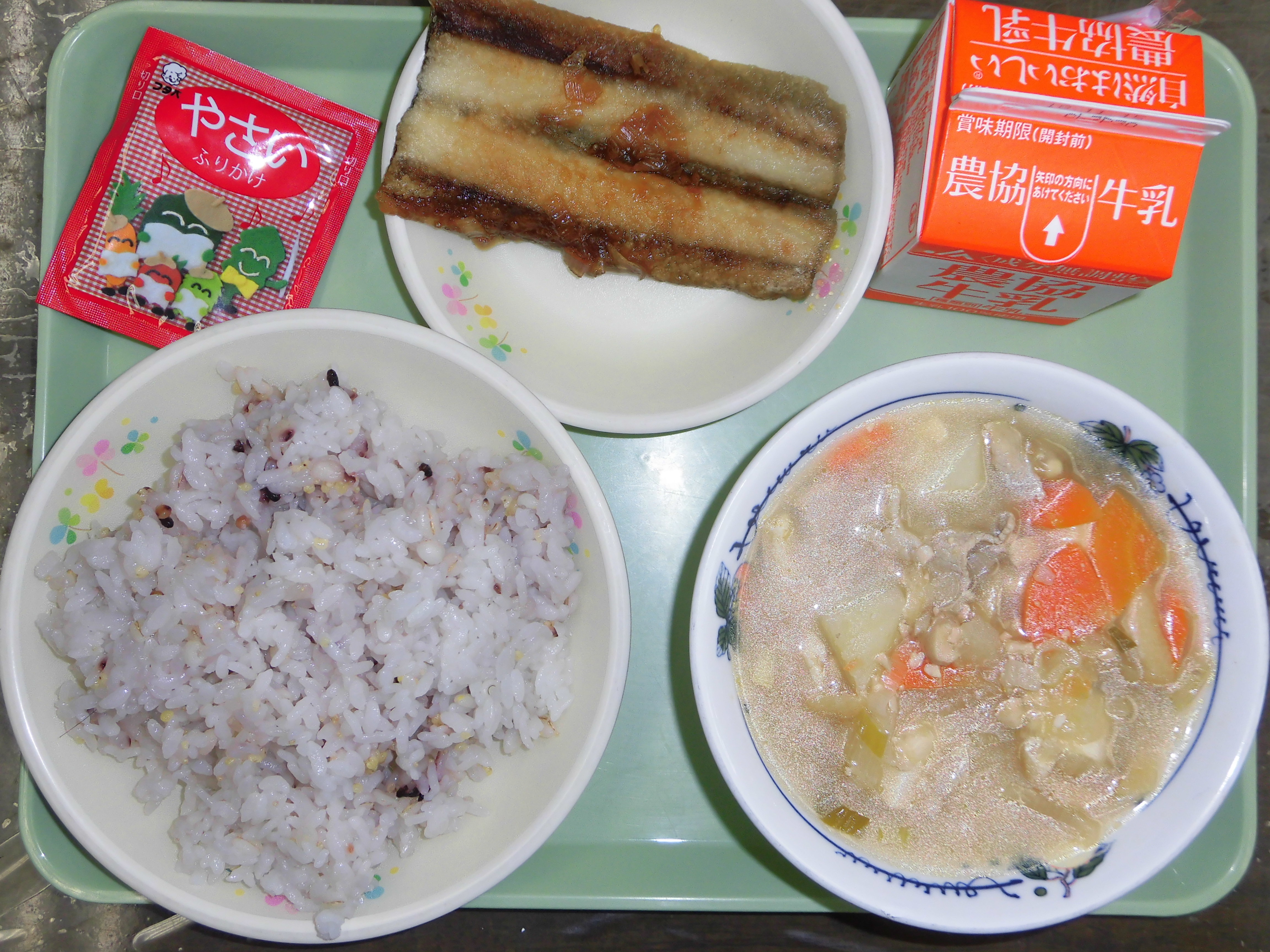 雑穀ご飯 サンマの揚げ浸し 呉汁 野菜ふりかけ 牛乳