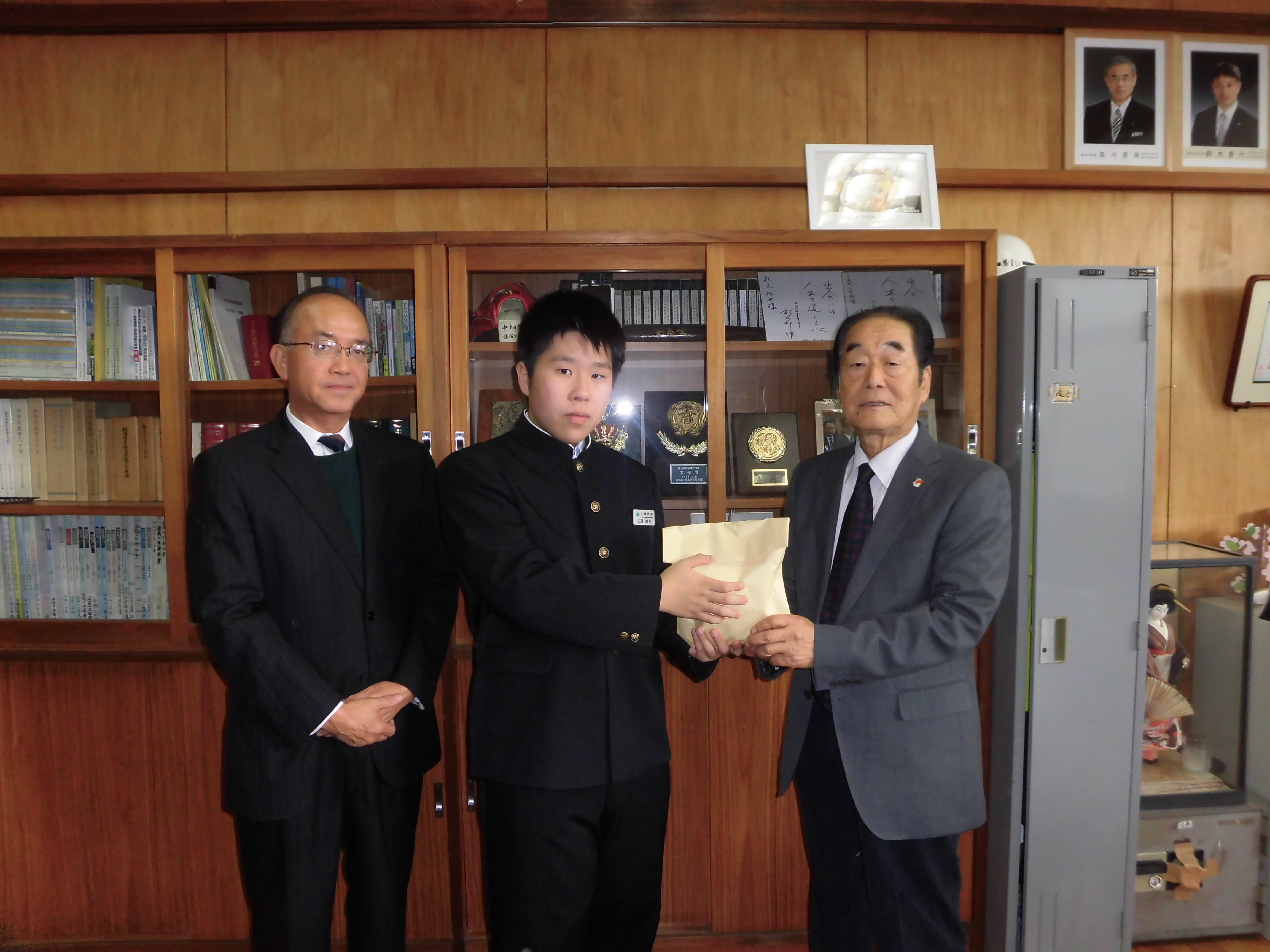 県共同募金いわき市共同募金委員会遠野分会長、志賀哲也様が来校され、生徒会奉仕委員長から募金が手渡されました。「高齢者や体の不自由な方のためにぜひ役立ててください。」