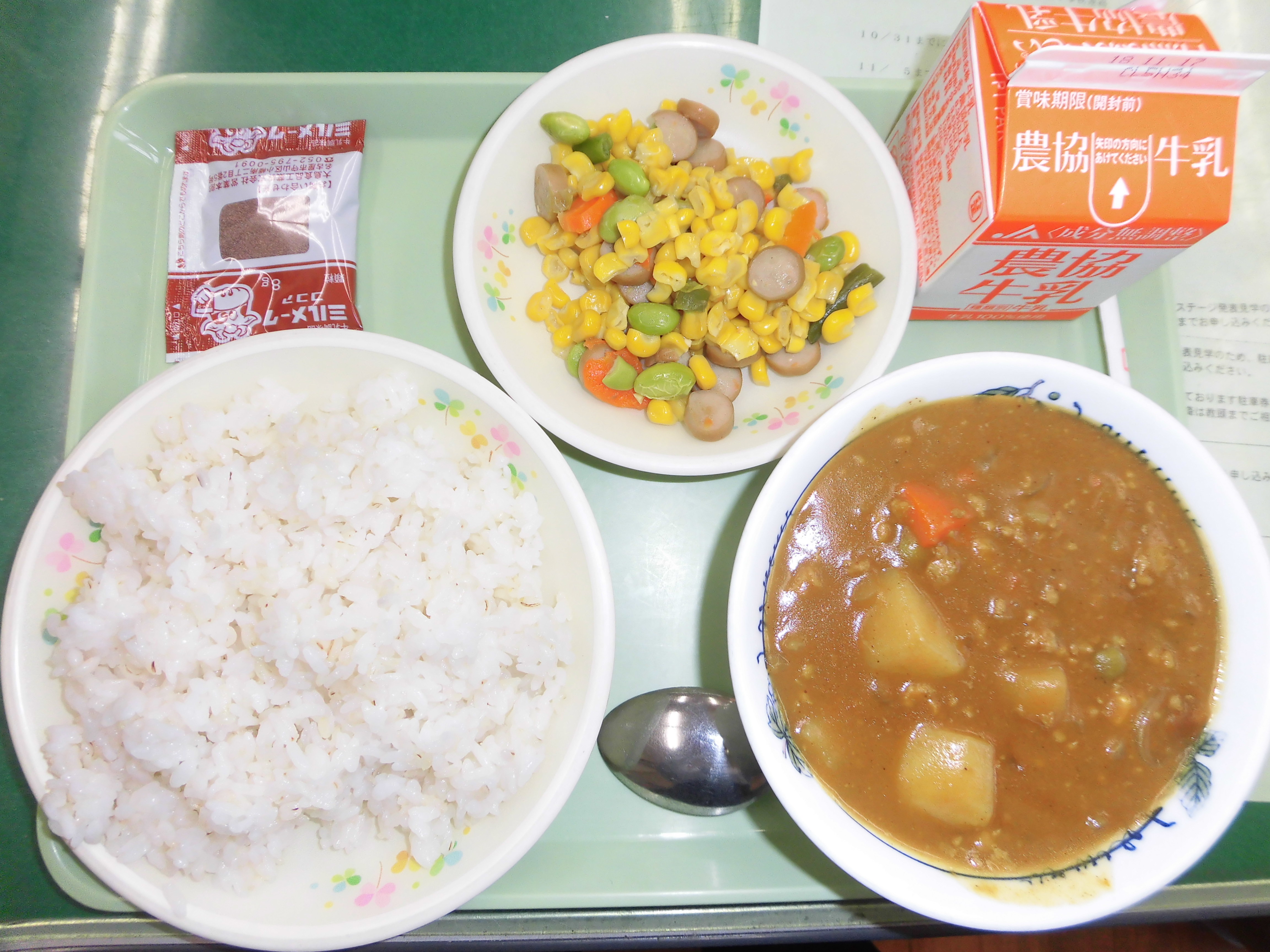 ポークカレー ライス(麦ご飯) ウインナーとコーンのソテー 牛乳 ココア