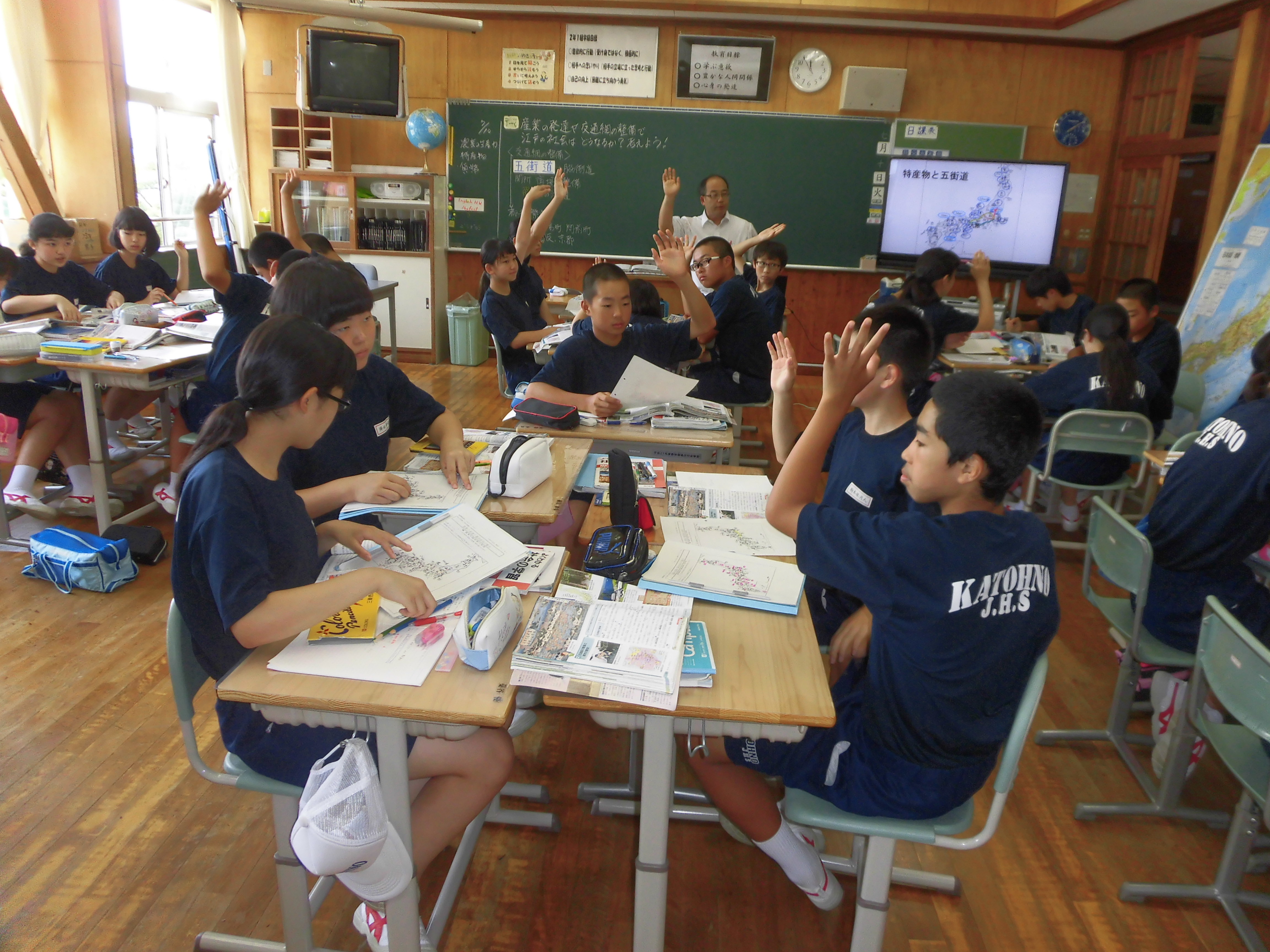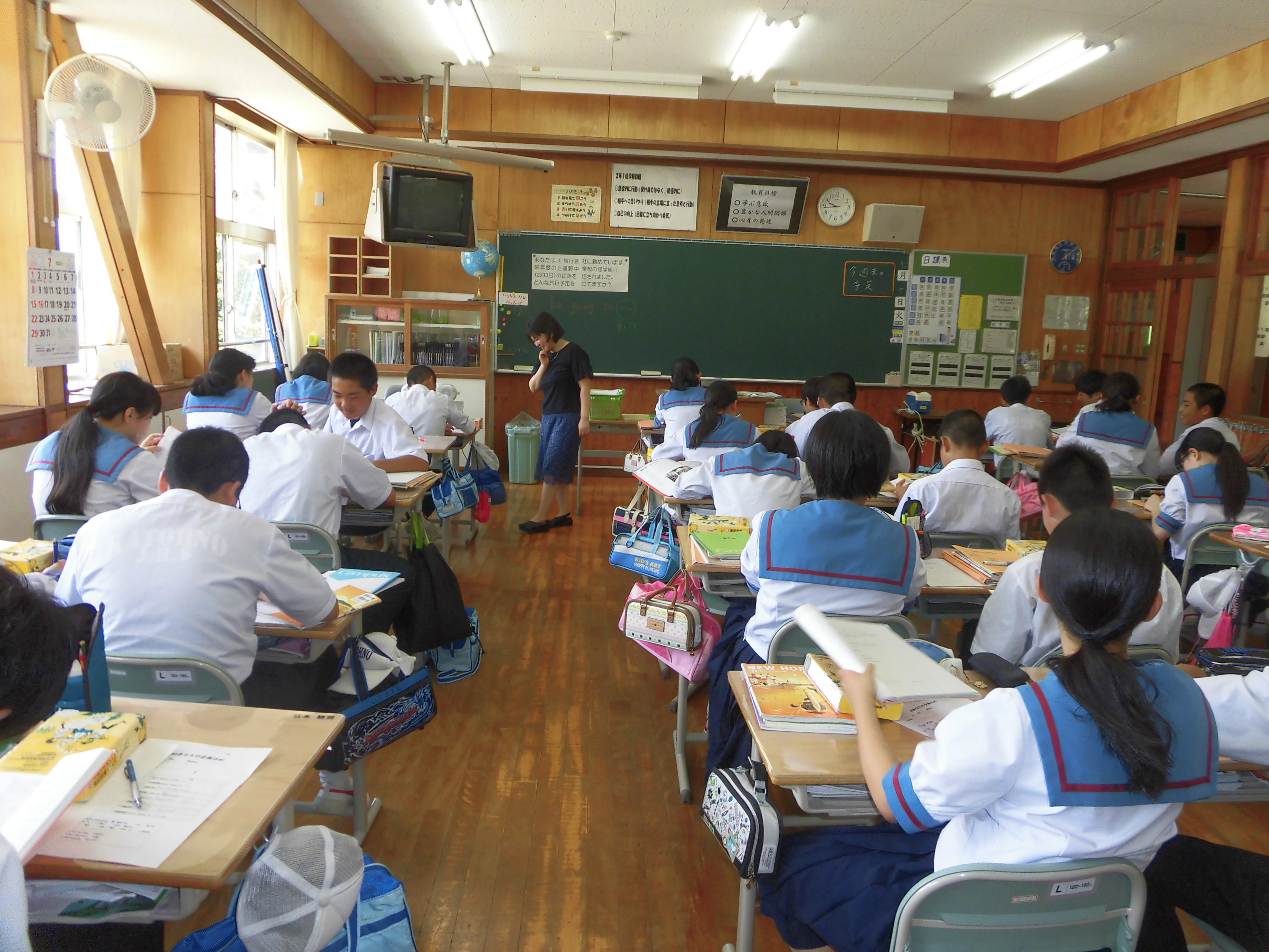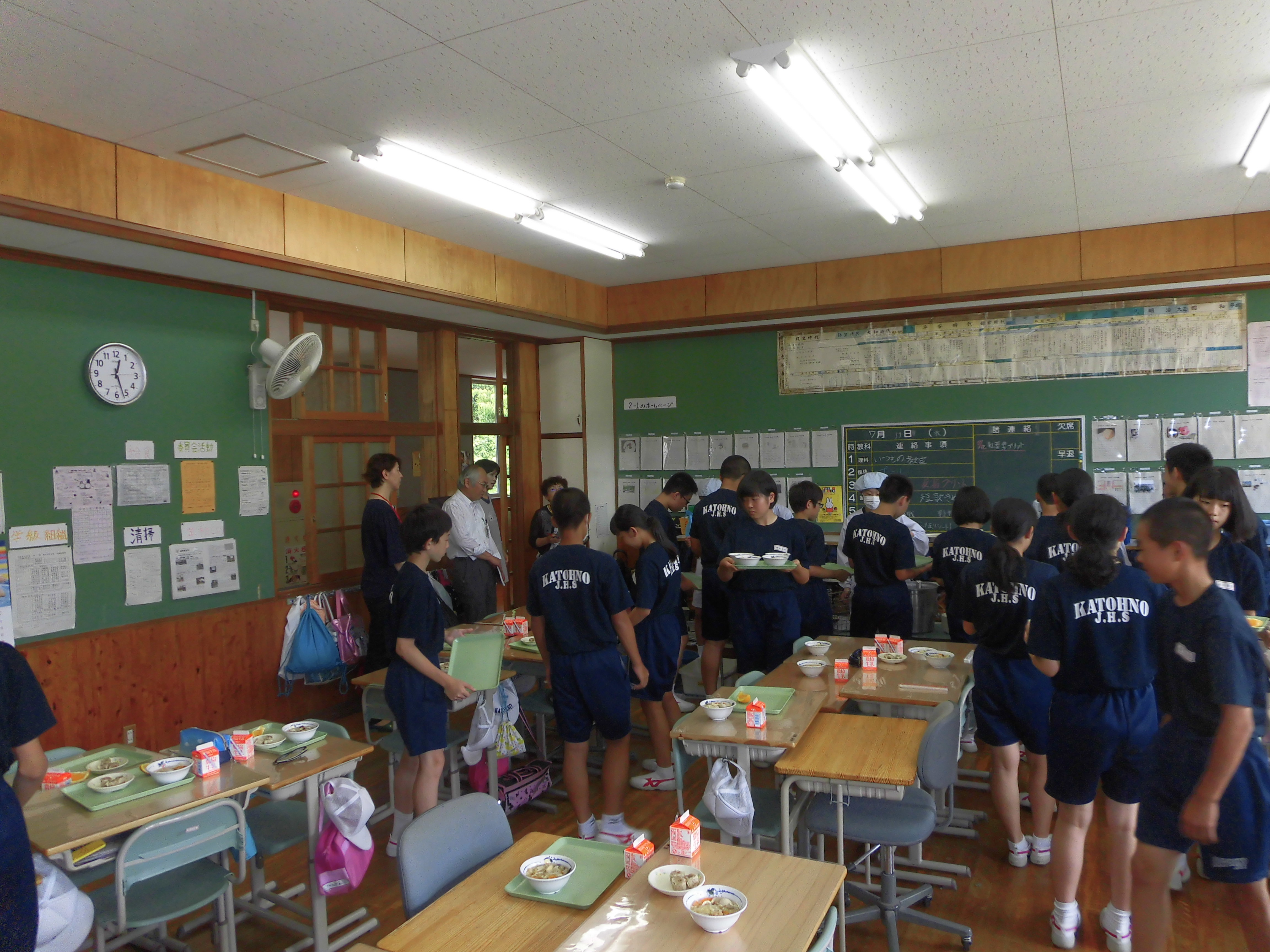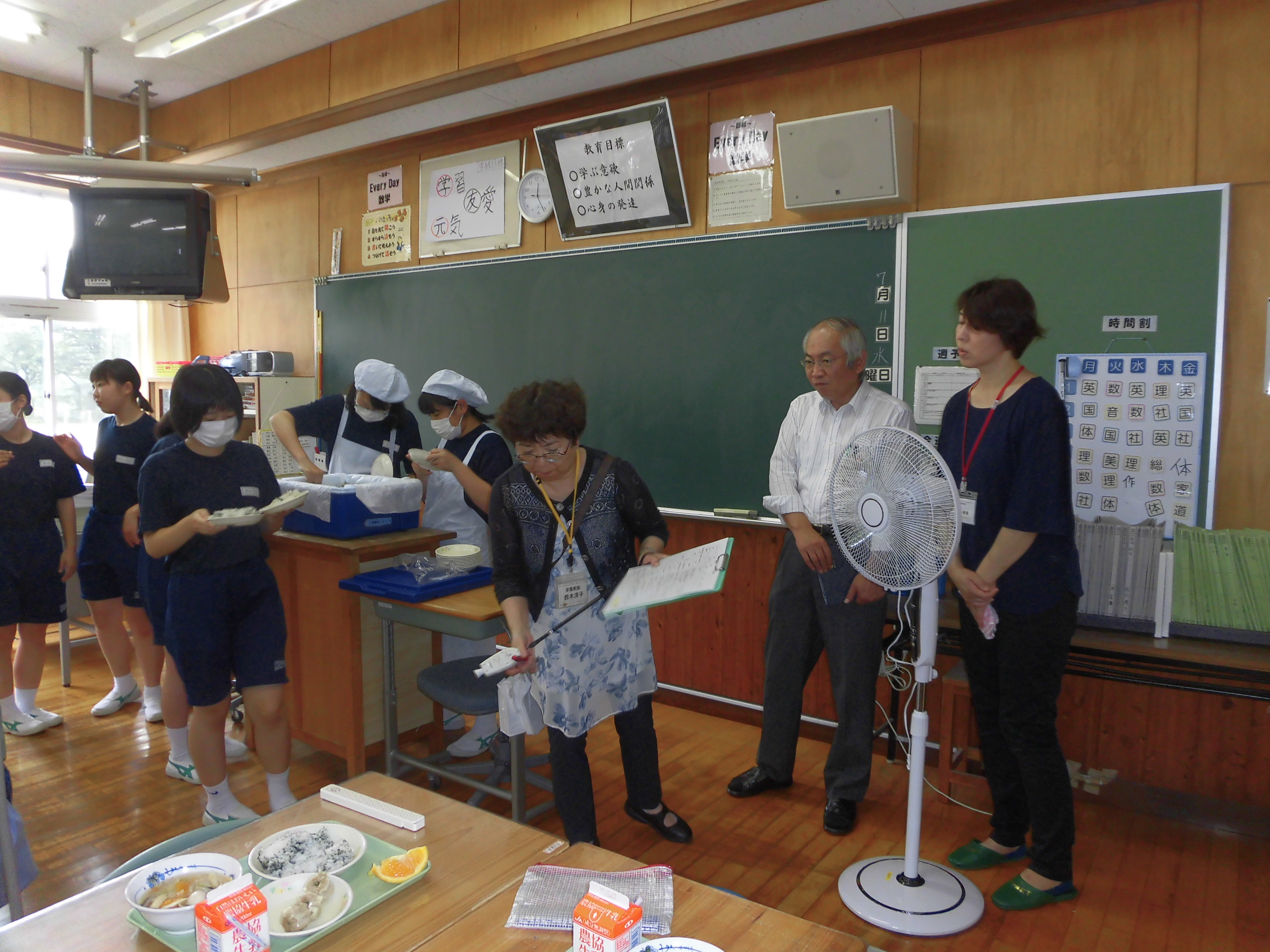 学校給食共同調理場より、主任主査、遠藤敏彦様を始め3名の職員の方々が、給食の時間に訪問されました。この訪問は毎年行われており、配膳や運搬が安全で衛生的に行われているかどうかを確認するものです。「上遠野中の生徒は、廊下、教室でのあいさつがしっかりしていますね。それと食べる姿勢がとてもよい。ただ、箸がとても短い生徒がいますね。食事のマナーにも影響します。」改善点についてもお話がありました。