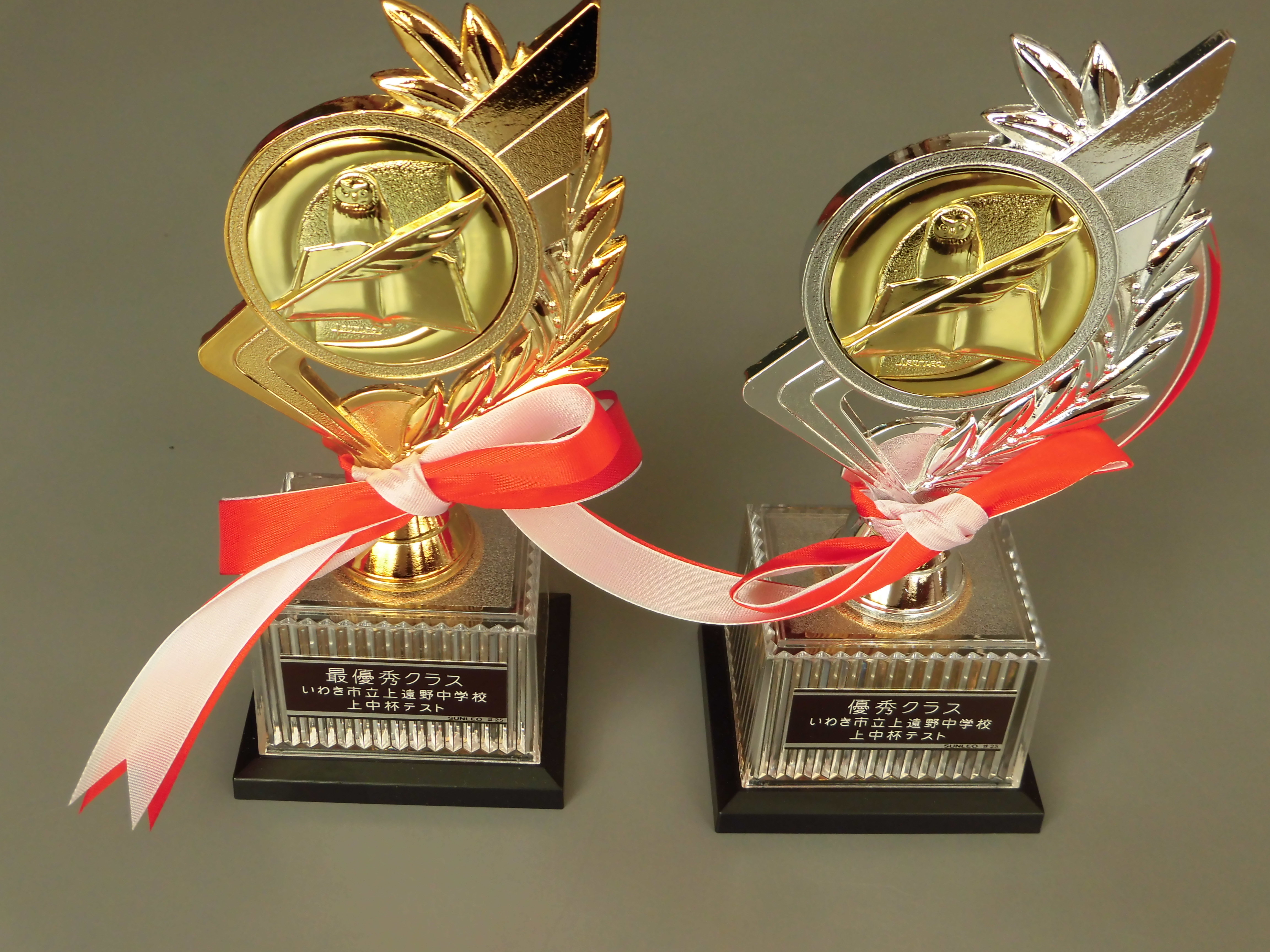 上中杯テストのねらいは、できる問題をミスをしない学習習慣の定着と、勉強が苦手な生徒を支え合いながらお互いに頑張る学習集団づくりです。問題は必ず満点が取れる基本的なもので、しかもテスト1週間前に配付します。つまり、努力すれば誰でも100点。個人では「100点満点賞」、クラスでは平均点1位の「最優秀クラス賞」をめざします。