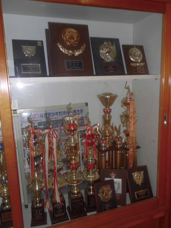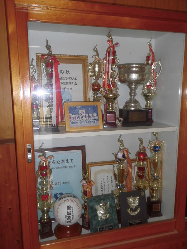 2018年6月7日 16時35分2階のホールにある棚には、トロフィーや盾、賞状が飾られています。